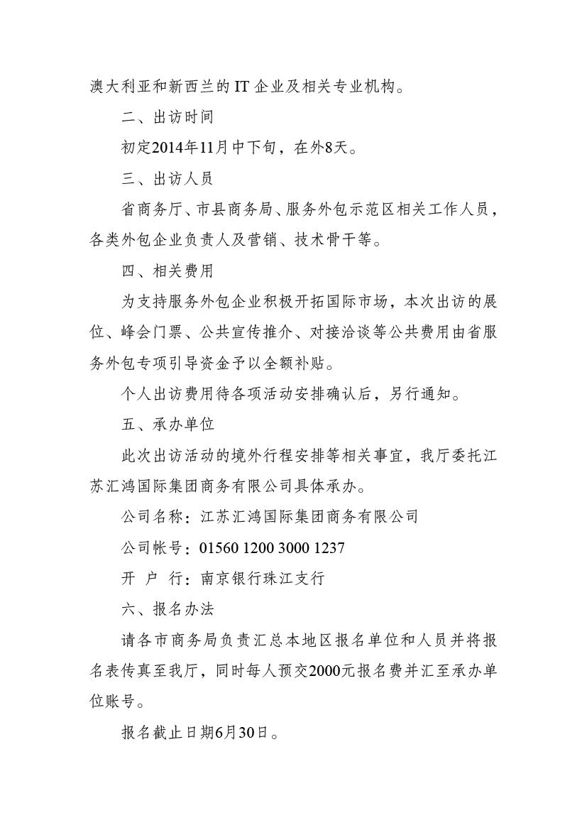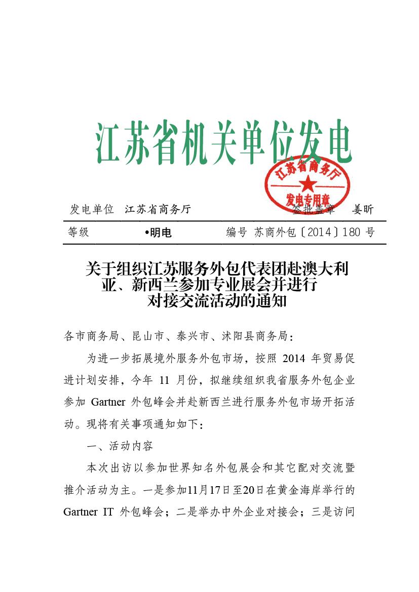 關(guān)于組織江蘇服務(wù)外包代表團(tuán)赴澳大利亞、新西蘭參加專業(yè)展會(huì)并進(jìn)行對(duì)接交流活動(dòng)的通知